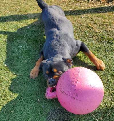 playing with jolly ball. Cujo does know some basic commands, good with dogs his size, but no small dogs or cats. Cujo is housebroken and crate trained. If there are children in his new family, we recommend they are over the age of 8.